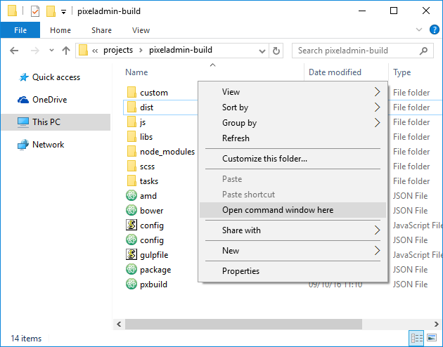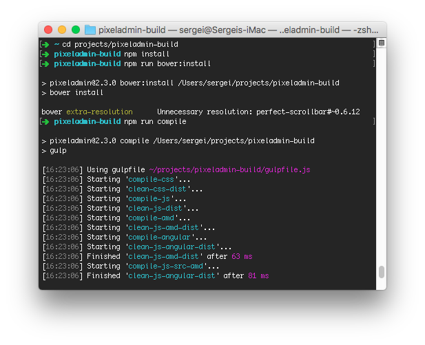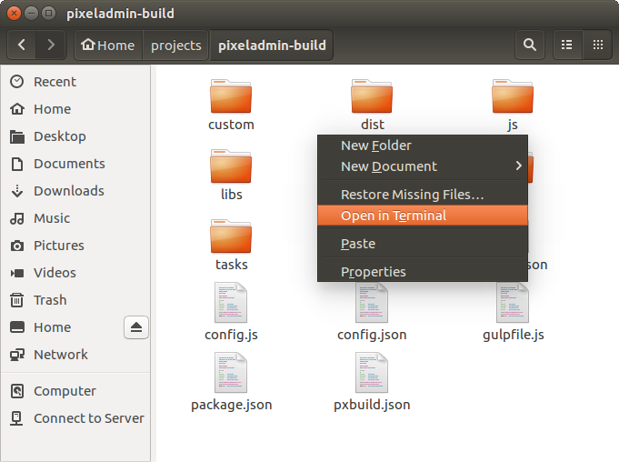 First of all, you need to open a terminal window and move to the PixelAdmin's source or custom build directory.